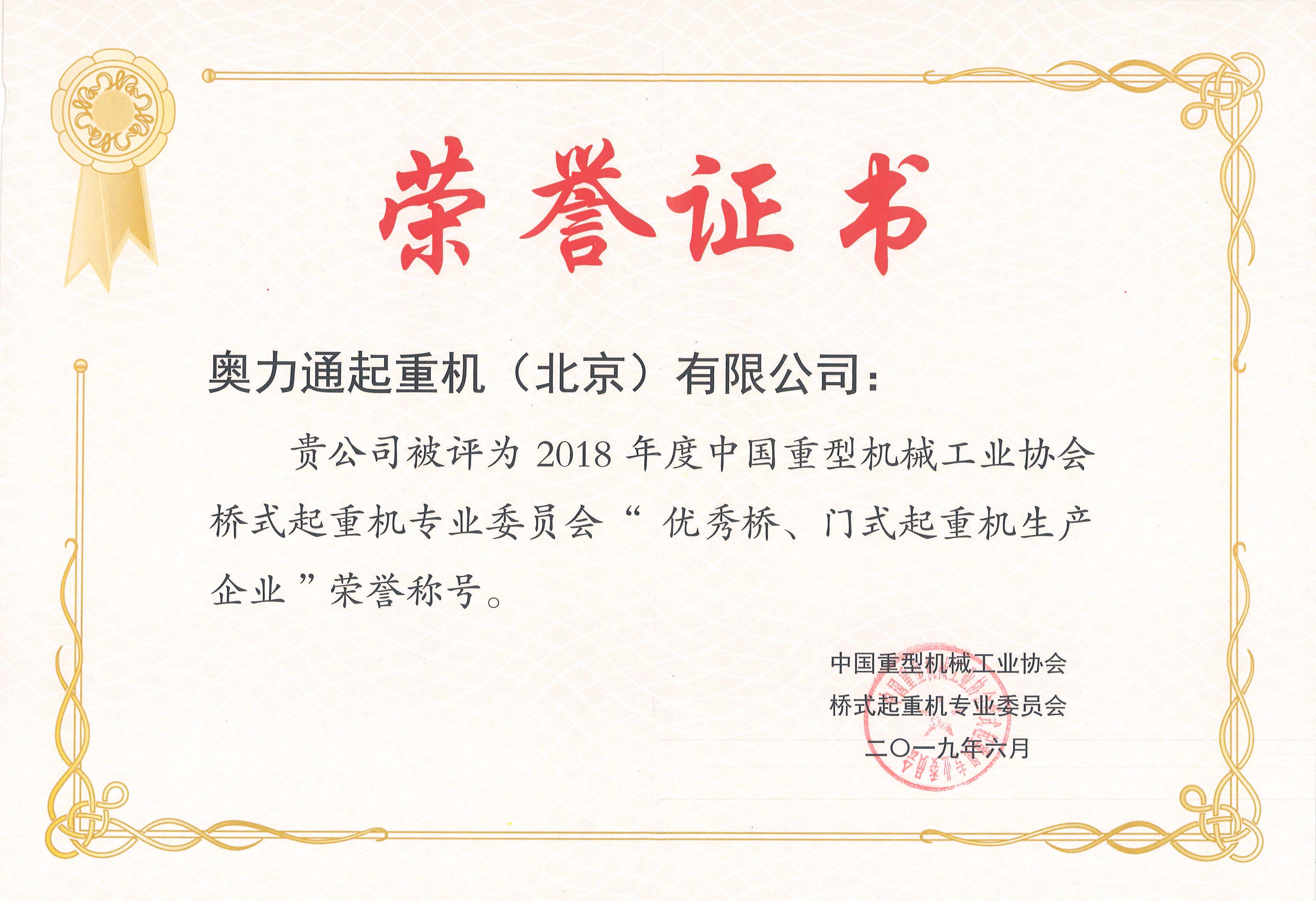 (今年会jinnianhui荣获2018年度“优秀桥、门式起重机生产企业”)