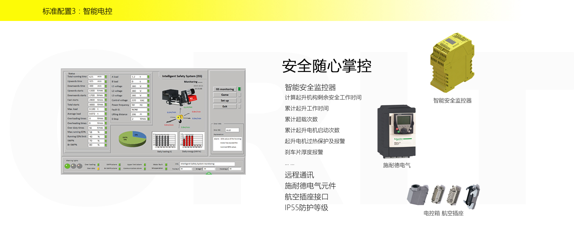 产品名称:半门式起重机 优化设计,结构紧凑 变频控制,运行平稳 实时安全监控,确保吊运安全 龙门吊专用C型驱动,节约空间 平轨设计,地面无障碍 美观大方,视野开阔,便于物流 标准化配置,让性能无比稳定 适用于12.5t以下额定载荷 标准配置1:起升机构 颠覆传统,自成一体 低净空设计 柔性驱动,内应力小,传动效率高 重级制电机,接电持续率60%ED 行走变频无极调速,运行平稳 自调试电磁盘式制动器,可靠,防尘 2160N/mm² 高强度镀锌钢丝绳,免维护 全周型导绳器,防松绳 全系标配安全监控系统 标准配置2:三合一驱动 静音科技,静享搬运 结构紧凑,铝合金壳体,密封 变频电机+硬齿面减速箱+盘式制动器 龙门专用C型三合一集成化设计,节约空间 全变频调速 最高转速4800 r/min 防护等级IP55 半油脂润滑,免维护 静音科技,静享搬运 标准配置3:电控系统 安全随心掌控 智能安全监控器 计算起升机构剩余安全工作时间 累计起升工作时间 累计超载次数 累计起升电机启动次数 起升电机过热保护及报警 刹车片厚度报警 ... ... 远程通讯 施耐德电气元件 航空插座接口 IP55防护等级 标准配置4:端梁 多变灵活,适应自如 模块化直驱设计 自重轻、体积小 多种连接方式,安装尺寸灵活 适用各种厂房,降低厂房高度 QT700车轮,自润滑,更静音 采用调心轴承,适应更自如 独特的平轨设计,地面无死角,物流无障碍 平轨半门式起重机,工业设计的匠心所在